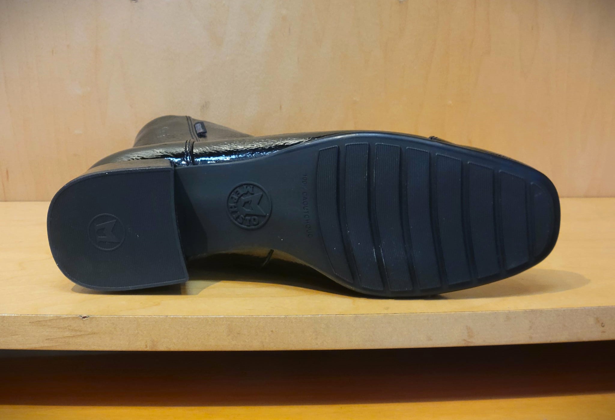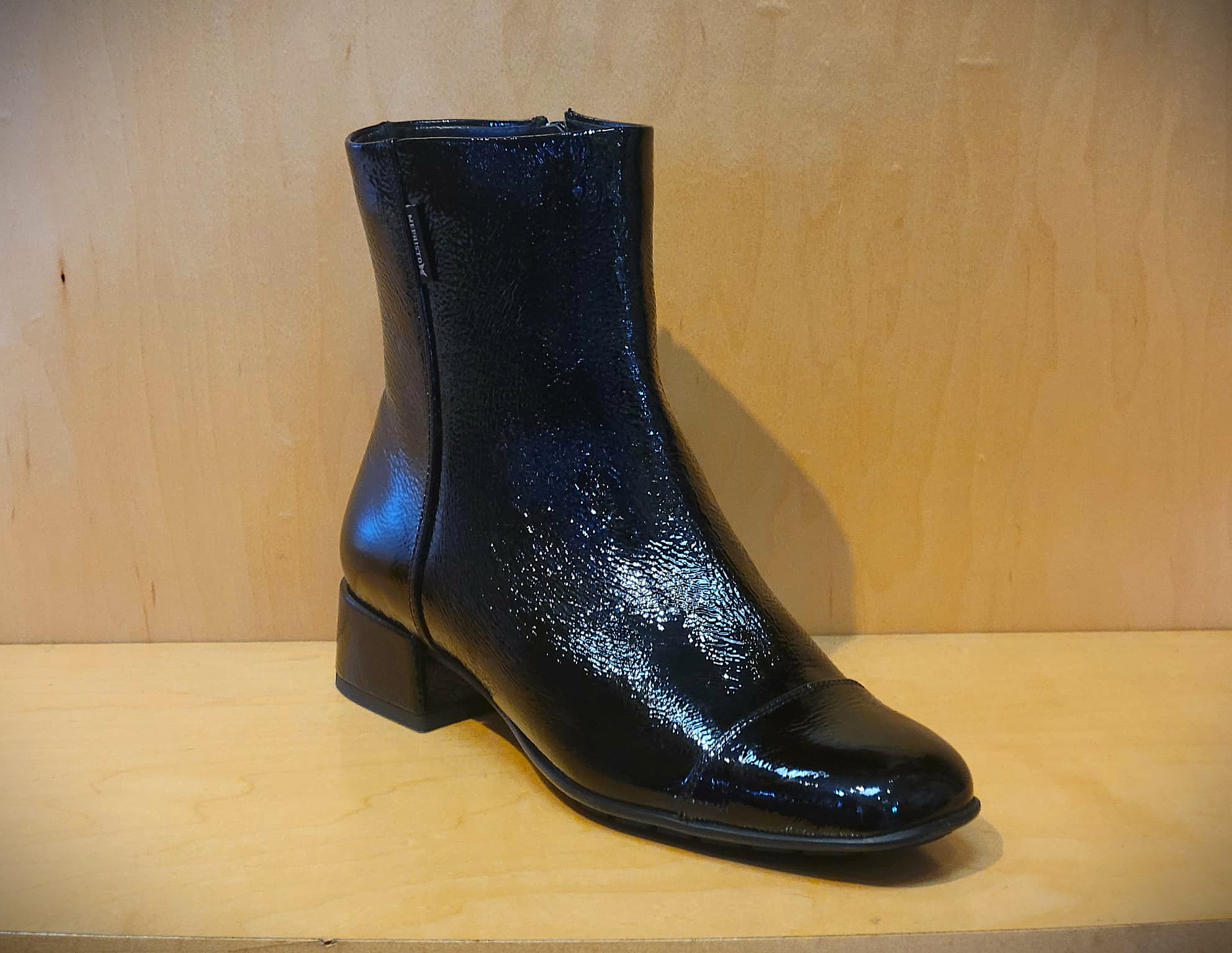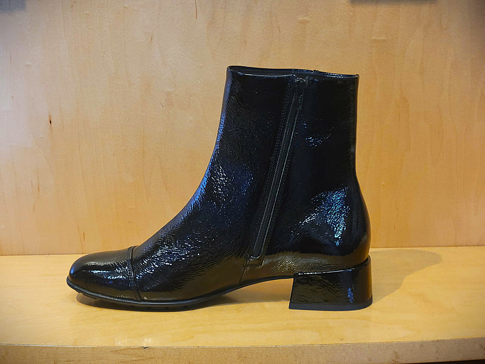 Jiliane is a heeled ankle boot that features a removable insole with SOFT-AIR Technology which reduces shock, a side zipper for easy on/off, and a soft, warm lining to keep feet warm. Jiliane is made from crinkled patent leather.